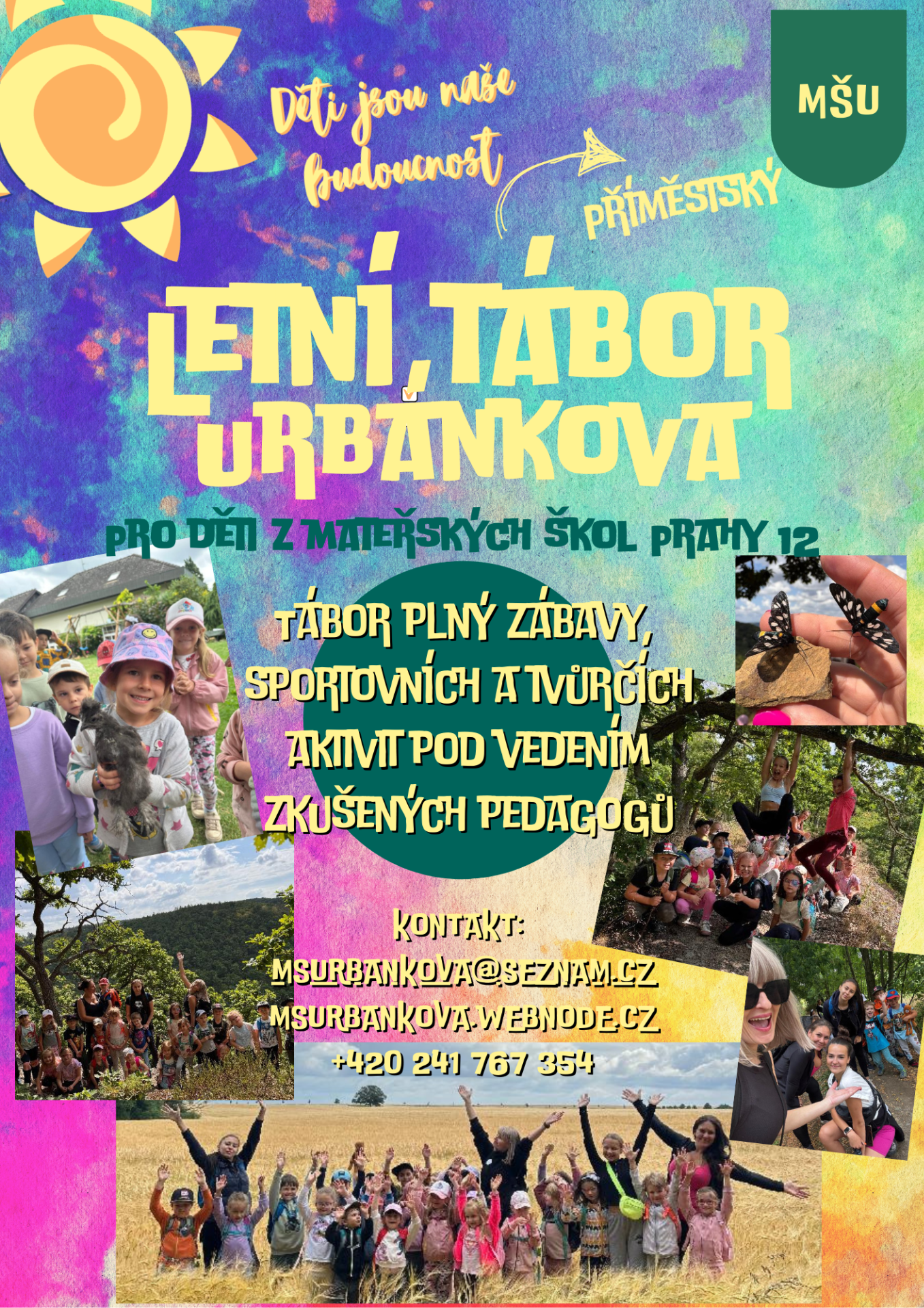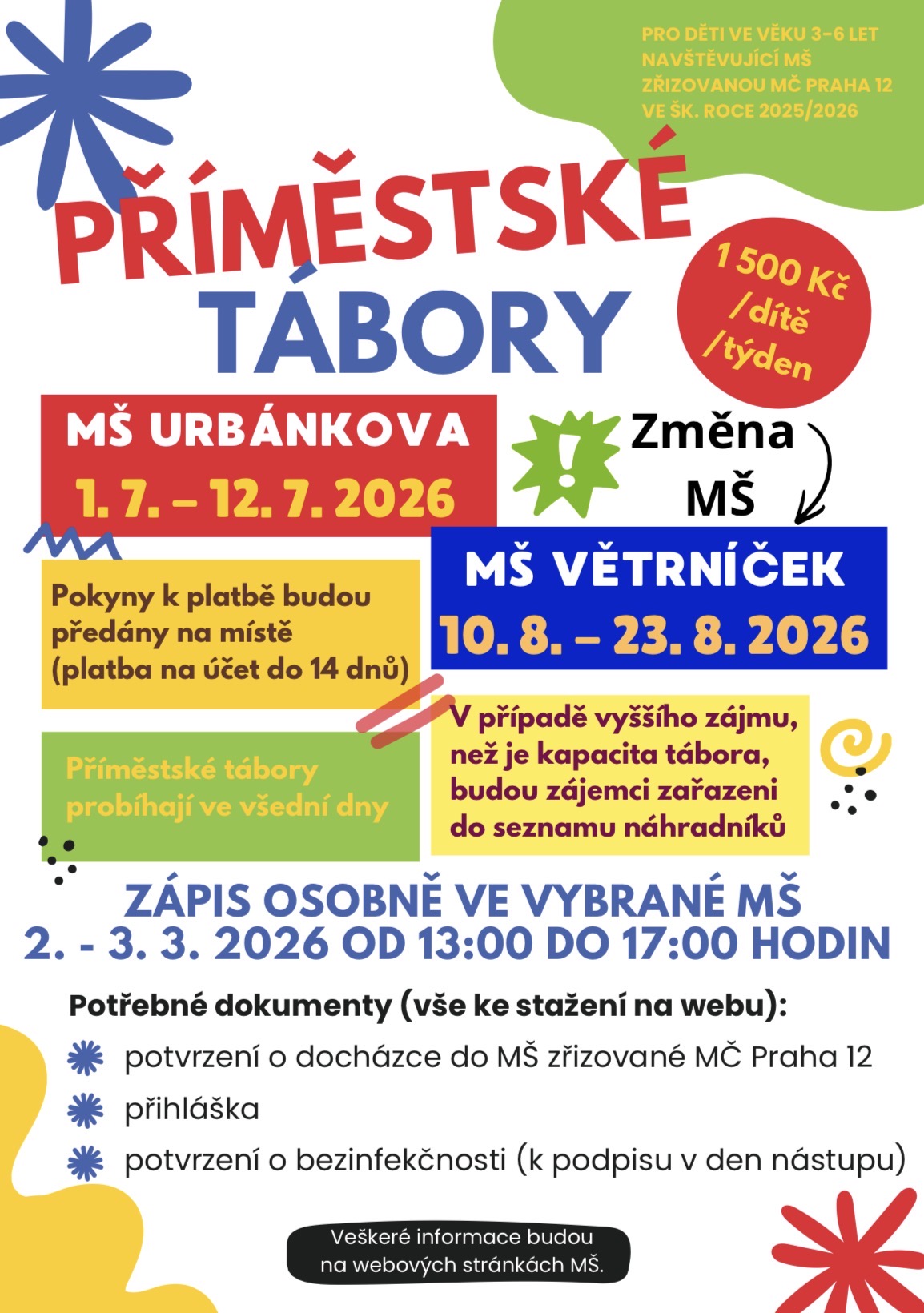 Přihlášku společně s potvrzením kmenové mateřské školy je třeba přinést osobně v termínu 2. 3. - 3. 3. 2026 od 13:00 do 17:00 hodin v budově mateřské školy Urbánkova 3374, 143 00 Praha 4 - Modřany. Tábory jsou určeny výhradně dětem, které jsou ve školním roce 2025/2026 zapsány k předškolnímu vzdělávání v mateřské škole na území městské části...